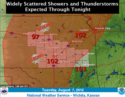 Rainbow to the north early TuesdayWidely scattered showers and thunderstorms this morning will diminish and drift south while additional activity is expected to redevelop this afternoon and tonight. The best chances for thunderstorms through tonight are expected to remain west of the Kansas Turnpike. A few strong storms with gusty winds and small hail will be possible. Another hot day is anticipated with most locations reaching or exceeding the century mark.