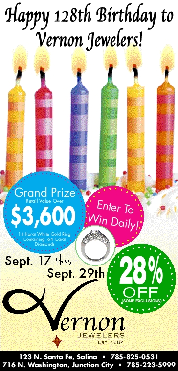 Vernon Jewelers is Celebrating 128 Years in Downtown Salina! Come in and get 28% OFF and Register to win 14 karat white gold and DIAMOND Ring Valued at over $3600.