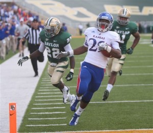 Kansas running back James Sims (29) scores past Baylor cornerback Joe Williams (22), left, in the first half on Saturday in Waco, Texas. (AP Photo/Waco Tribune Herald, Michael Bancale)