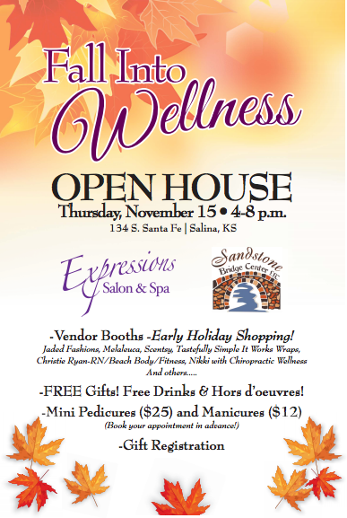 Expressions Salon & Spa and Sandstone Bridge Center are hosting an Open House “Fall Into Wellness” Thursday Nov. 15 from 4-8pm.