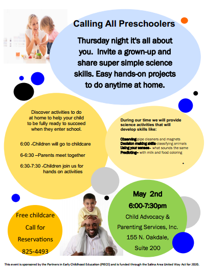 CALLING ALL PRESCHOOLERS! Posted on May 1, 2013 Thursday night it’s all about you. Invite a grown-up and share super simple science skills. Easy hands-on projects to do anytime at home.