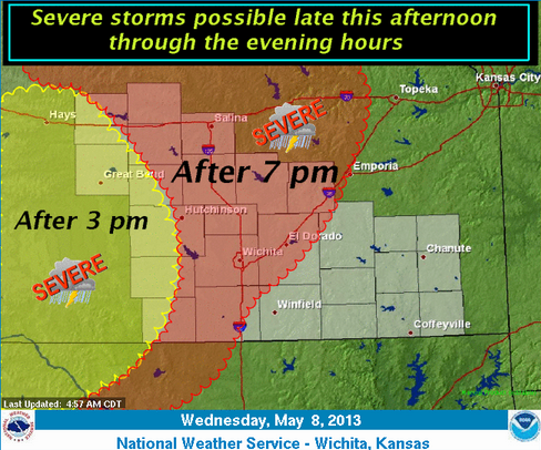 Storms are expected to develop this afternoon over west and southwest Kansas and track east through the evening hours. Locations generally west of Interstate 135 can expect to experience these storms after 3 pm with the remainder of central and south central Kansas seeing the storms after 7 pm. Large hail and down-burst winds will be the main threats.