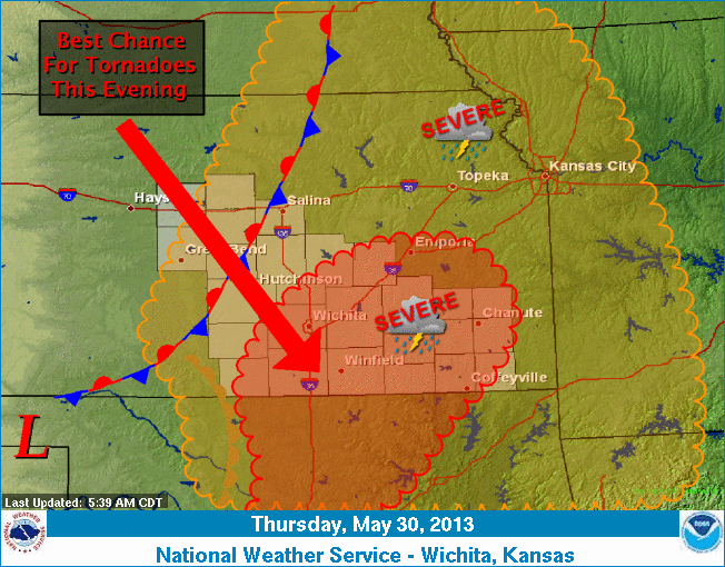 Severe storms are expected to develop this afternoon and evening. Supercell thunderstorms with very large hail…damaging winds and tornadoes are possible across south central and southeast Kansas. Locations south of highway 50 will have the best chance for tornadoes and are shown in the red hatched area. Thunderstorms will develop into a large complex late tonight with the threats transitioning to strong winds and heavy rain across southeast Kansas.