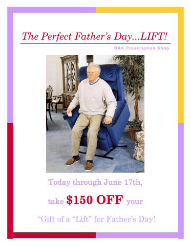 Give Dad a Father’s Day gift he’ll appreciate every day of the year….a Lift Chair from B&K Prescription Shop! Our Lift Chairs are manufactured by a Medical Equipment Company, so you can rest easy knowing that Dad’s new chair is safe, durable and comfortable. And today through June 17th, all Lift Chairs at B&K are $150 OFF our regular prices. B&K Prescription Shop….601 East Iron, Salina.