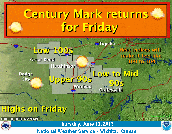 After a slight cool down today…the intense heat will return for Friday. Temperatures will range from the low 90s to the low 100s. The highest temperatures will be across central and portions of south central Kansas. High relative humidities will cause heat indices to be between 100 and 104. take precautions during outdoor activities.