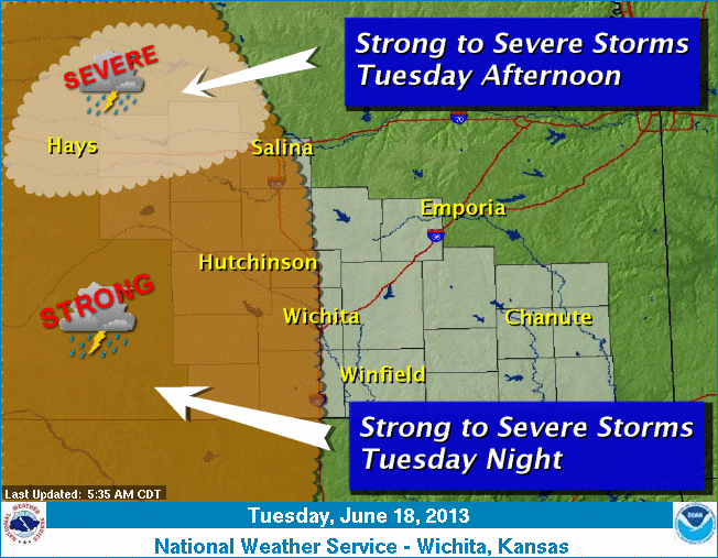 Strong to severe storms are possible this afternoon roughly north of I-70 in central Kansas. Another round of strong to severe storms is possible late Tuesday night, roughly west of a line from Salina to Wichita to Wellington.