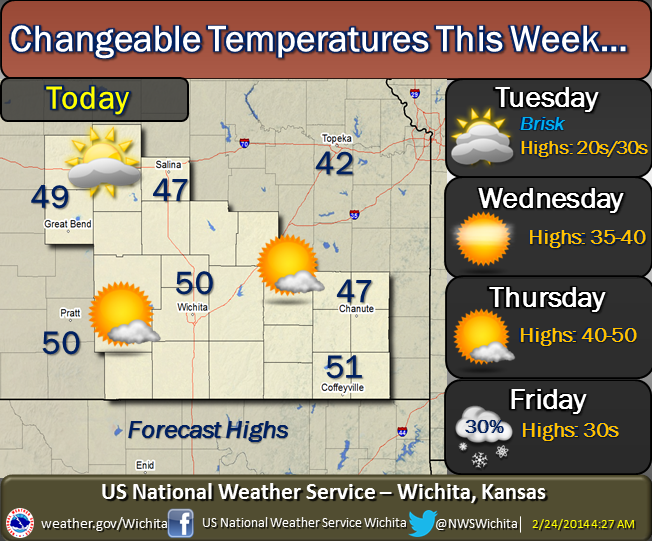 This week will feature changeable temperatures from day to day, ranging from near normal to much below normal. There is a 30% chance of light snow Thursday Night into Friday. A storm system that could bring accumulating snow and colder temperatures into the region may move into the area Sunday.