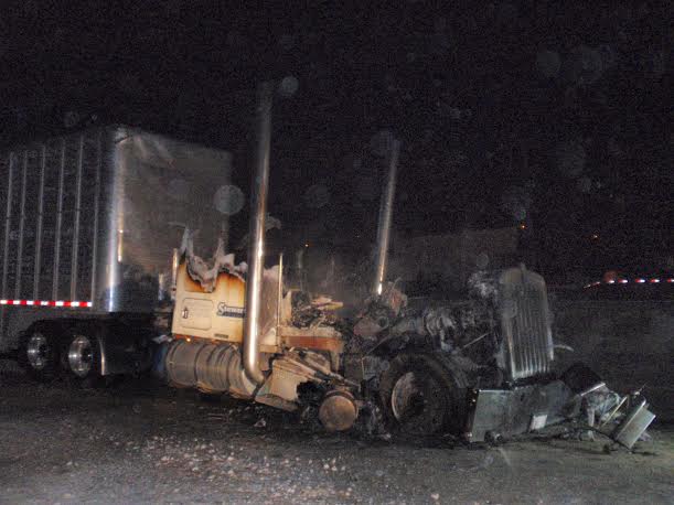 A semi truck is destroyed by fire early Thursday morning while it was parked near the Farmers and Ranchers Livestock just west of Salina at 1500 W Old Highway 40.