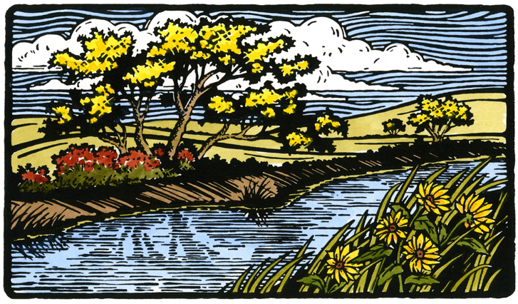 “Stephen’s distinctive style and technique bring a bold graphic to the Festival Print collection,” says Festival Visual Arts Coordinator Karla Prickett. “His defining black-line work and hand coloring highlight a familiar imagery. Patrons and viewers alike will engage and relate to this river landscape as it is central to our lives and this region.”