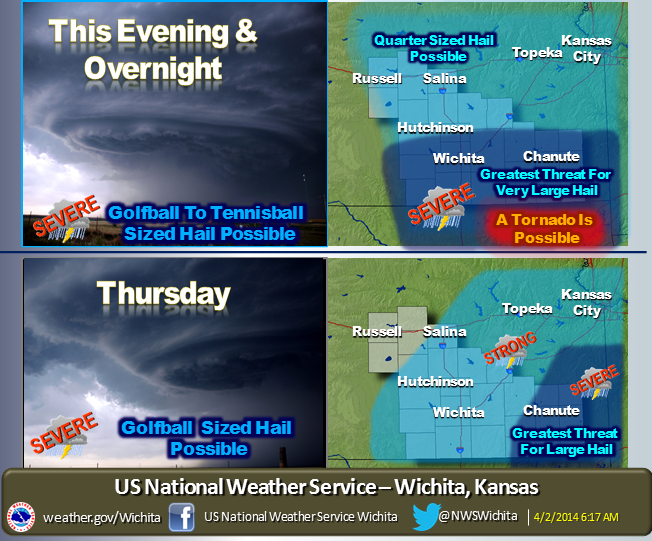 The potential for very large hail is increasing for all areas…especially this evening & overnight. Areas at greatest risk for hail as large as tennis balls are indicated. A couple tornadoes are also possible across extreme South-Central & Southeast Kansas this evening. On Thursday…the greatest risk of severe thunderstorms…capable of hail as large as golfballs…would shift east over Southeast Kansas. Thunderstorms are also possible for most of the remaining areas…a few of which may be severe with quarter-sized hail possible.