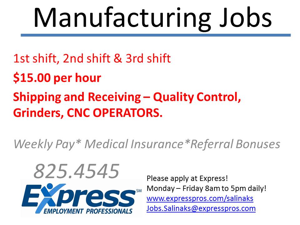 Express Employment Professionals has partnered with a manufacturing plant looking to hire skilled, dependable individuals! If you have prior manufacturing experience – CNC, Grinders, Welders, Quality Control, Fabrication – Visit Express Employment Professionals TODAY!