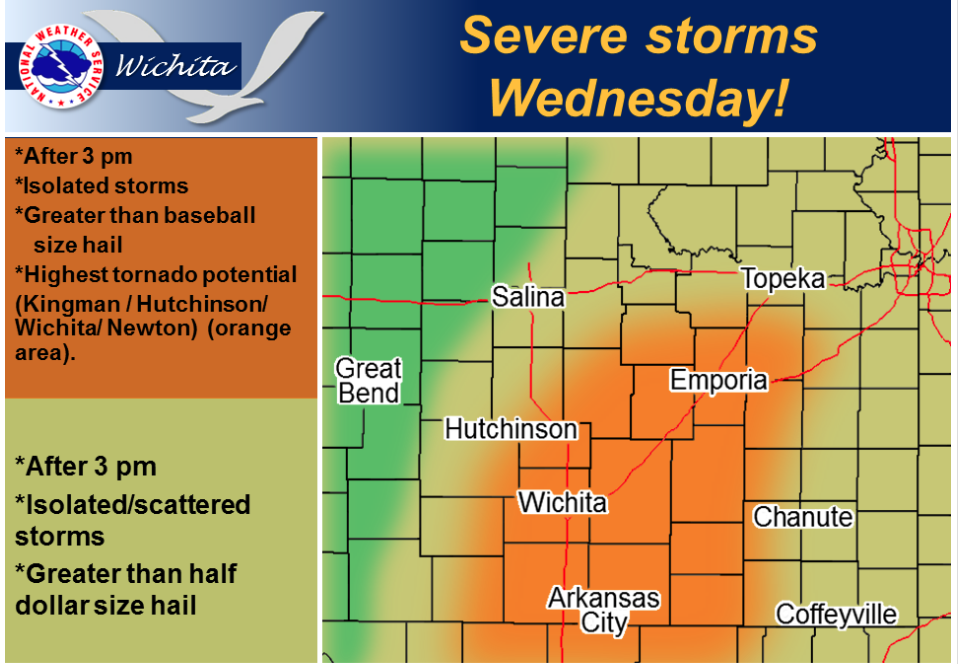 Severe storms likely after 3 pm Wednesday. Supercell storms are expected to remain isolated with very large hail and tornadoes possible. The greatest risk for significant severe storms looks to be over South Central Kansas, including Kingman, Hutchinson, Wichita, Newton and Wellington