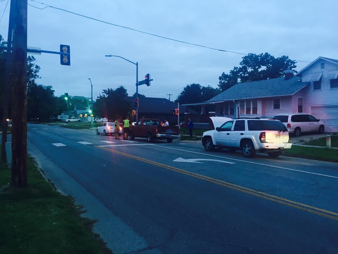 Shortly before 8:30 p.m., a sport utility vehicle, a pickup truck, and a passenger car, appeared to collide in a chain reaction rear-end accident just north of the intersection of 9th & Walnut.