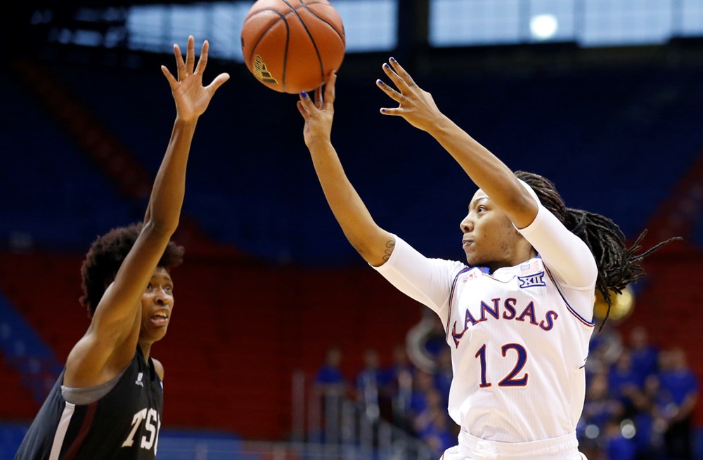 Both teams continued to struggle from the field in the early moments of the second half, as the Jayhawks shot 1-of-5 and the Lady Tigers missed the mark on their first four attempts. TSU caught fire again, however, draining four baskets in a row, which cut Kansas’ lead to eight points halfway through the third quarter. Johnson stepped up with a nice turnaround floater after O’Neal found her on the baseline with a pass that split two Tiger defenders.