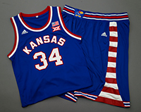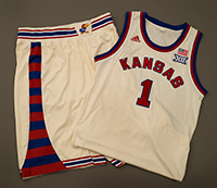 Designed with royal blue and cream tones, the jerseys feature classic block lettering and numbers used during basketball’s early years. The jersey includes crimson, blue and white accents, while the shorts feature a two-color stripe as a nod to Kansas’ classic look and feel.