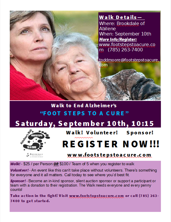 Brookdale of Abilene invites you to take part in “Foot Step To A Cure” on Saturday, September 10th at 10:15 a.m. Take action in the fight and walk to end Alzheimer’s Disease. For more information, call 785-263-7400. Additional information can be found at FoodStepToACure.com or in the flyer below:
