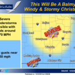 It’ll be a balmy, windy and stormy Christmas as a powerful system surges northeast from New Mexico to the Nebraska/South Dakota border. Winds sustained from 30-40 mph with gusts around 50 mph are likely, but also a line of severe thunderstorms will surge east across Kansas that’ll likely produce winds around 70 mph. Stay tuned.