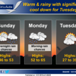 Above normal temperatures are expected for Sunday and especially Monday with a significant cool down forecast for Tuesday. Light rain will be possible Sunday night into Monday morning.