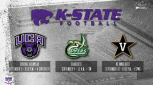 MANHATTAN, Kan. – Highlighted by consecutive home games to open the season and a trip to Vanderbilt in week three, game times and television designations for Kansas State’s first three football games were announced by the Big 12 Conference and its television partners Wednesday afternoon.