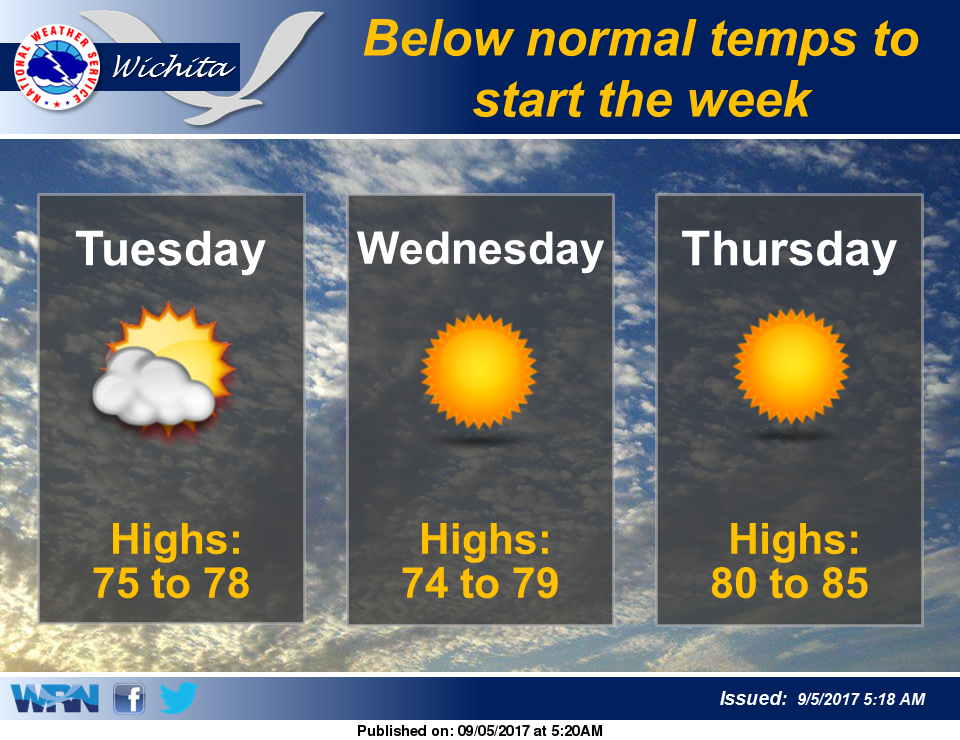 Below normal temperatures expected Posted on September 5, 2017 Below normal temps are expected to start the week with a small warm-up as the weekend approaches. #kswx