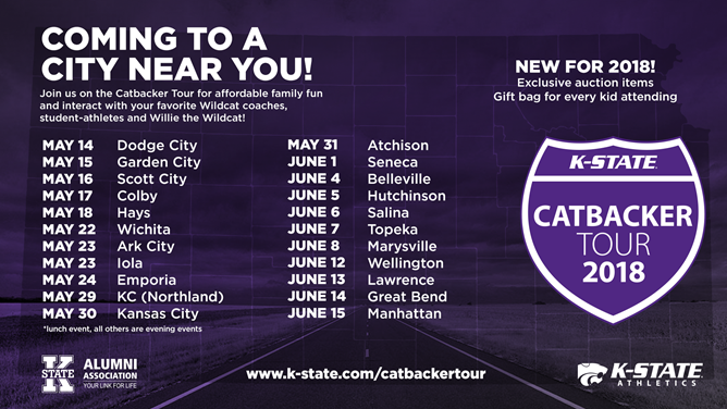 MANHATTAN, Kan. – K-State Athletics is heading to a town near you as the department kicks off the 2018 Catbacker Tour of the state of Kansas Monday in Dodge City.