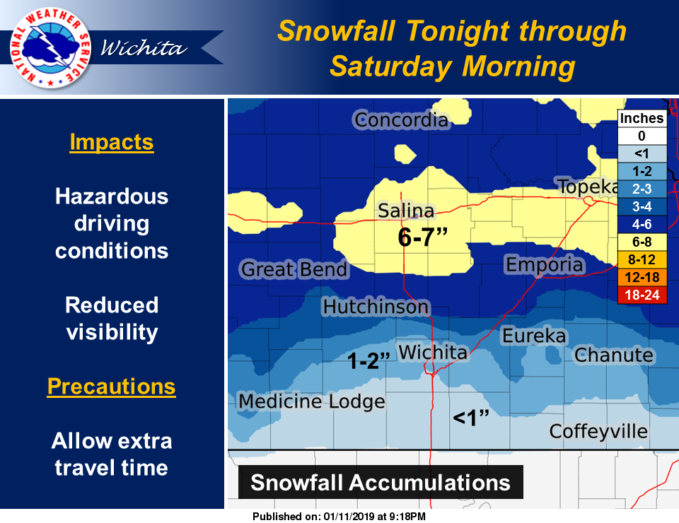 According to the National Weather Service office in Wichita (NWSW), the winter storm warning is in effect until noon Saturday. Snow, which occasionally is expected to be heavy, will affect much of central Kansas, but especially the counties along Interstate 70. Total accumulation is now forecast to be six inches.