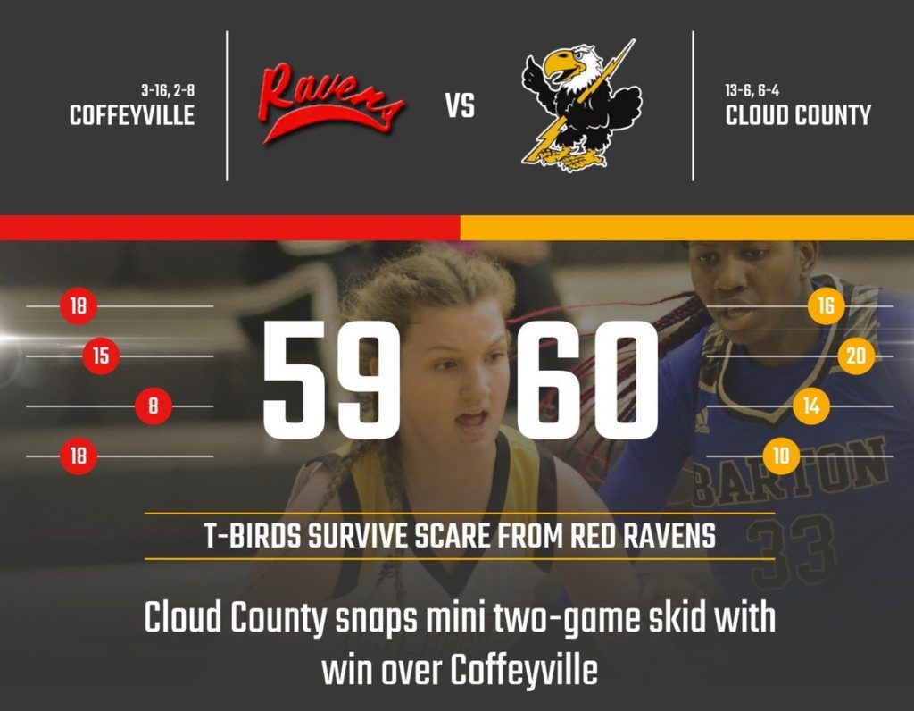 CONCORDIA, Kan. — It wasn’t always pretty, but the Cloud County Community College women’s basketball team’s gritty 60-59 victory over Coffeyville Community College on Wednesday was a much-needed lift for a T-Birds team still trying to get firing on all cylinders this spring semester.