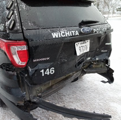 The officer suffered minor injuries when a vehicle struck the Wichita Police Department SUV at an accident scene in the southbound lanes on Interstate 135, according to a social media report from Chief Gordon Ramsay.