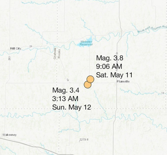 According to the Kansas Geological Survey, the two largest were magnitude 3.8 at 9:06a.m. Saturday and a magnitude 3.4 at 3:13a.m. Sunday. The United State’s Geological  Survey also reported a 2.6 magnitude quake centered 8 miles northwest of Plainville on Sunday.