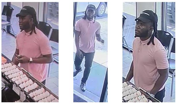 He is described as a black male, tall, stocky, with shoulder-length braided hair, wearing a salmon-colored polo shirt, and a black baseball cap.