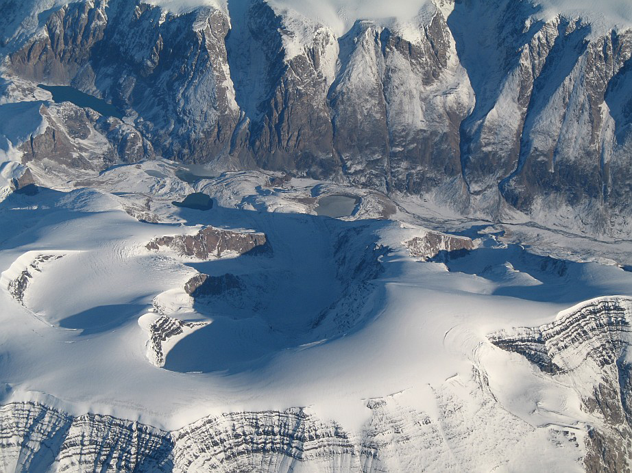 An aerial shot of Greenland. Much of the country is covered in ice and snow. Photo © Túrelio (via Wikimedia-Commons), 2006