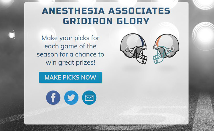 Get your strategy set and sign up for the 2019 season of Anesthesia Associates’ Gridiron Glory! There will be a number of great prizes to win, including Kansas City Chiefs tickets! All you have to do is pick the winners of the match-ups each week.