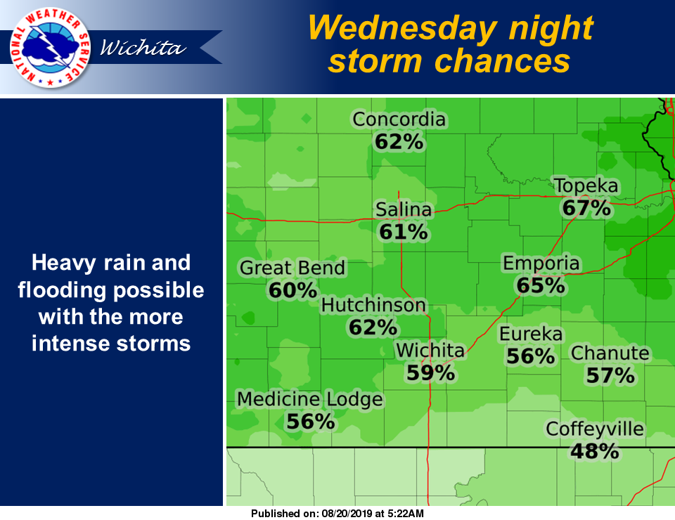 Additionally, NWS has reported that storms are expected this evening and overnight for mainly central Kansas. The stronger storms will be capable of hail up to nickel size, 50 mph winds and heavy rain.