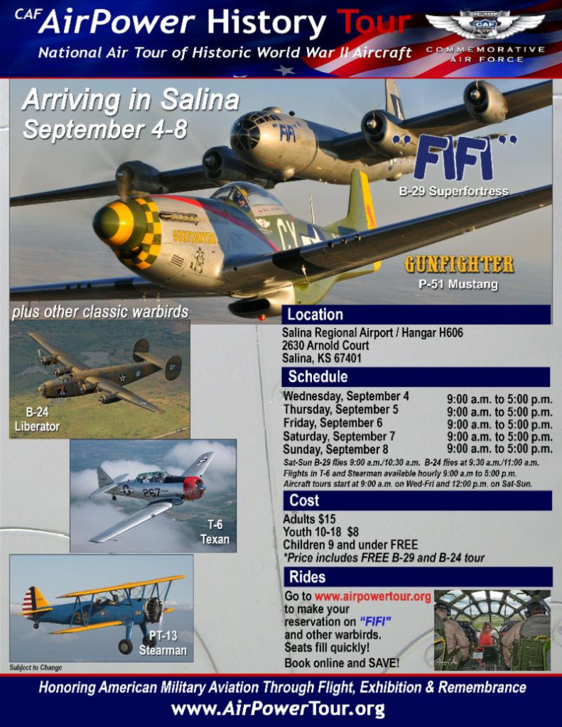 The aircraft will be staged at the Salina Regional Airport, Hangar H606, 2630 Arnold Ct. The event will be open to the public from 9 a.m. until 5 p.m. Wednesday through Sunday. Access to the ramp where the warbirds are parked is $15 for adults, $8 for children ages 10-17 and free for children nine and under. Supporting aircraft will be offering rides all five days. The B-29 flies on Saturday and Sunday at 9 a.m. and 10:30 a.m. The B-24 flies on Saturday and Sunday at 9:30 a.m. and 11 a.m. Cockpit tours of the B-29 and B-24 will be available beginning at 9 a.m., except on Saturday and Sunday when they will begin at noon.