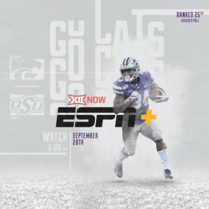 MANHATTAN, Kan. – The Big 12 Conference and ESPN announced Monday that Kansas State’s Big 12 Conference opener at Oklahoma State on Sept. 28 will kick off at 6 p.m., and be streamed live on Big 12 Now on ESPN+.