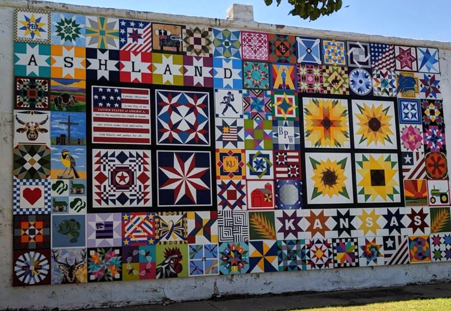 Today, Kansas’ largest barn quilt is a 30 x 16 foot display of gorgeous homemade art in downtown Ashland. The words Ashland Kansas are spelled out in big letters. The panels include patriotic and sunflower designs, plus individual quilt blocks with designs that are meaningful for families and community organizations. For example, there is a 4-H block, a Girl Scout block, etc.