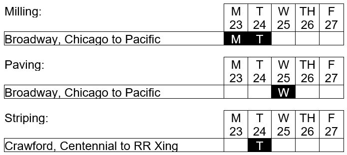 According to information from the City of Salina, Monday through Wednesday, APAC Shears of Salina will continue work on the City of Salina’s annual asphalt mill and inlay project. The schedule is as follows, weather permitting: