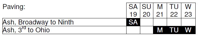 According to information from the City of Salina, Saturday through Wednesday APAC Shears of Salina will continue work on the city’s annual asphalt mill and inlay project. The schedule is as follows, weather permitting: