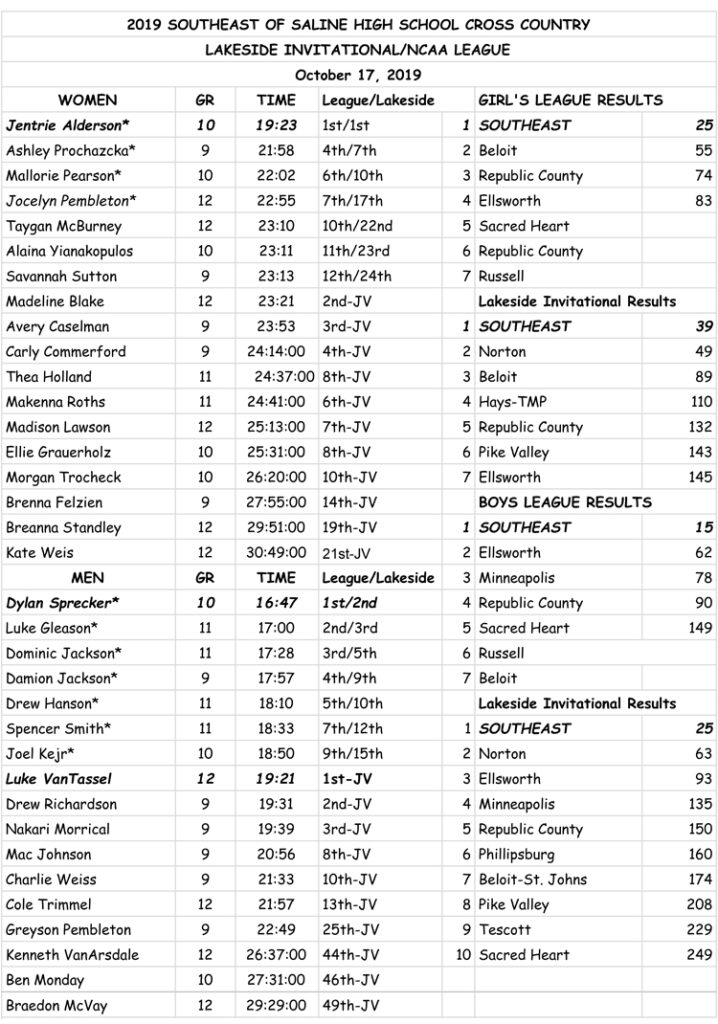 The Southeast of Saline cross country results from the Lakeside Invitational/NCAA League meet. Not only did Southeast Of Saline win the team championships, but the Trojans also had the individual race league champions: Jentrie Alderson and Dylan Sprecker.